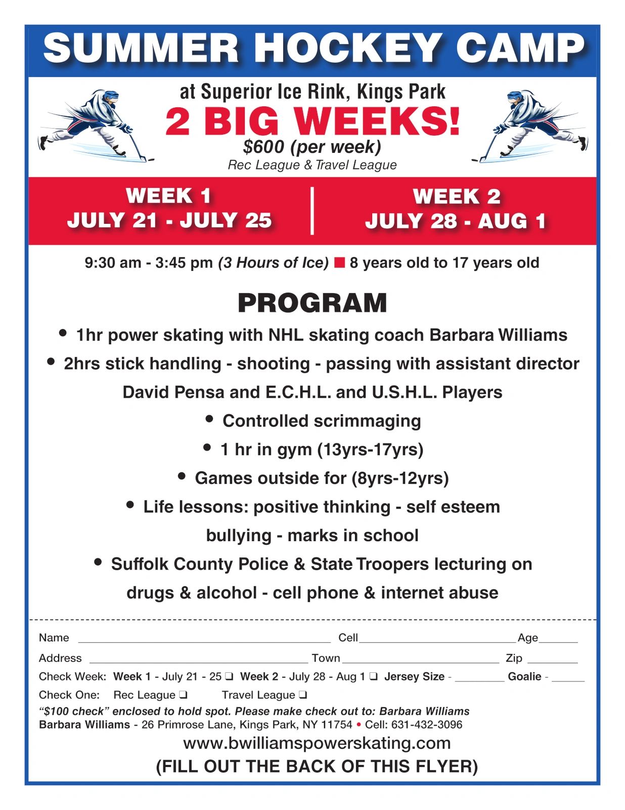 "My entire program is designed for the development of the "total" hockey player; physically, mentally and emotionally. You won't find another program that matches it's excellence.I do not believe in gimmicks to make a better hockey player.Dedication,hard skating,skill level and motivation all make for a better hockey player.I don't believe in inexperienced coaches that lack professional training. All coaches on my staff are professionals.You will get the best coaching and training that is possible. Your skills, self esteem and character will be enhanced." - Barbara Williams